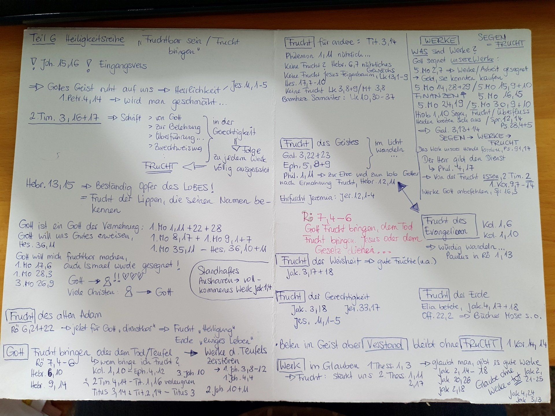 Tun, was Gott aufgetragen hat - Dienen ist vielfältig - Jede Erfindung ist geistiges Eigentum des Erfinders, wir gehören Gott. Wir sind sein geistiges Eigentum. Er kann mit uns machen, was er will - Wer sind wir, dass wir mit Gott rechten wollen? Rö. 9,20 - Der Töpfer hat die Macht, aus den Gefäßen welche zur Ehre und andere zur Unehre zu machen, Rö. 9,20+21 - Soll der Töpfer dem Ton gleichgeachtet werden? Jes. 29, 15+16 - Vorsicht vor Hochmut gegenüber dem Schöpfer - Nicht mit dem Schöpfer hadern, Jes. 45,9 - Rühmt sich die Axt gegenüber dem, der sie haut? Jes. 10,15 - Aktiv tun oder Passiv Frucht hervorbringen - In diesem Video geht es um "passives" Frucht bringen - Sammele Bibelstellen im Bibelstudium, keine Meinungen - Der Begriff Frucht taucht in unterschiedlichen Kontexten auf, s. Blätter, incl. Bibelstellen - Die Frucht, die bleibt, kommt aus einer Quelle, die von Gott ist - Dort, wo es scheinbare Widersprüche in Lehren gibt, liegt meist eine große Wahrheit, erforsche sie selbst - Wir dürfen Gott um Weisheit und Erkenntnis bitten, er wird sie uns geben, Jak. 1,5+6 - Joh. 16,13 – 1. Joh. 2,27 - Hebr. 4,16 - Empfangen aus Gnade, Gott zur Ehre, uns zum Segen -Wir bringen Frucht "in" diesem Leben und "für" das ewige Leben - Frucht aus dem Fleisch (Eigenwille) oder Frucht aus dem Geist (aufgrund unserer lebendigen Beziehung mit Gott und durch Leitung durch den Heiligen Geist) - manche neigen dazu, zu bequem zu sein, andere, zu viel tun zu wollen, beides ist nicht gut, der Herr korrigiert - Tun, was der Heilige Geist sagt, denn Gottes Gedanken sind höher als unsere Gedanken und Gottes Wege sind höher als unsere Wege, Jes. 55,9 - Frucht ist die Folge von etwas. Das Korn wächst und bringt Frucht. Zuerst den Halm, dann die Ähre, dann der volle Weizen in der Ähre, Mk. 4,28. Empfehlung dazu das Arbeitsheft: „Erfolg ist das, was folgt“ - Bringst du Frucht wie die Humanisten bzw. wo genau unterscheidet sich deine Frucht von denen der Humanisten? Unsere Frucht kommt von Jesus, direkt vom Vater aus dem Himmel - Jeder Baum, der keine „gute“ Frucht bringt, wird abgehauen und ins Feuer geworfen, Mt. 7,19. Was ist gute Frucht? Ich glaube, dass gute Frucht diejenige ist, die Christus in/durch uns hervorbringt und nicht das, was wir selbst, für unsere Ehre, tun, wie es die Pharisäer gemacht haben. Zu ihnen hatte Johannes gesprochen. Wir wollen Frucht bringen, wie es in Joh. 15 beschrieben ist