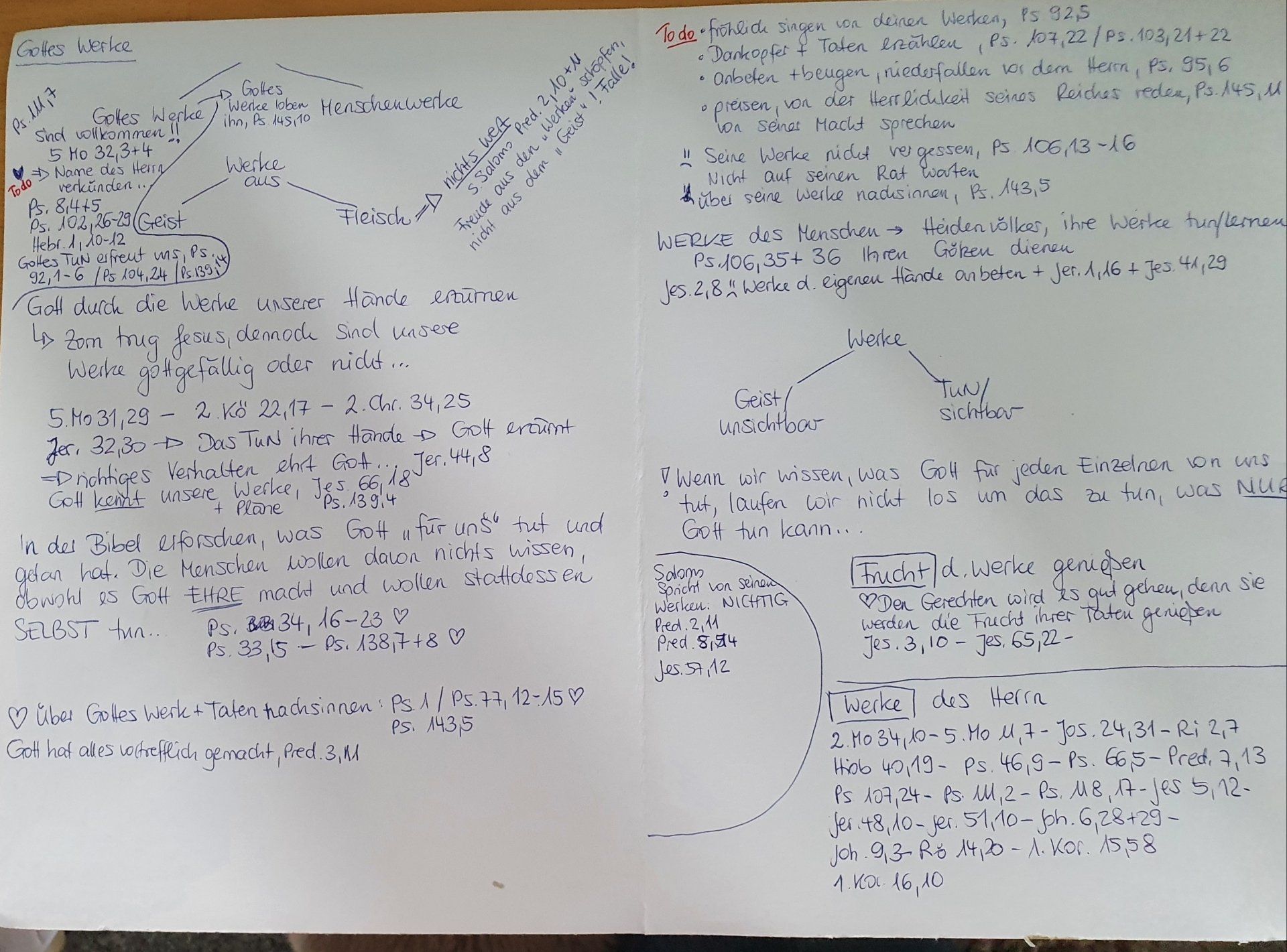 Gott beschenkt uns reich, weil wir seine Kinder sind - Wir können uns reich beschenkt fühlen, weil Jesus für uns gestorben ist, Lk. 21 - 1. Thess. 5,16-19 - lebendiges Wasser, Joh. 4,5-42 - Vorsicht vor dem Drang, etwas tun zu wollen, Hebr 4,16 - 1. Petr. ,10 - 2. Tim. 1,9 - Mt. 6,33 - Oberflächliche, christliche Taten, aus eigenem Willen - Der Herr fördert das Werk unserer Hände, Ps. 90,17 - Gott lässt wachsen, wir sind seine Gefäße, Mk. 4,26-34 - 1. Kor. 3,6+7 - Ps. 127,1 - Kann unser Werk im Feuer bestehen? 1. Kor. 3,13 - Fundament auf Felsen gründen, 1. Kor. 3,13 - Mt. 7,24-29 - Gott gibt uns Brot zur Speise und Same zum säen, 2. Kor. 9,10 - Untereinander Gutes tun, an den Hausgenossen des Glaubens, Gal. 6,10 - Erst nach dem Reich Gottes trachten, dann kommt alles andere, Mt. 6,33 - Wir wollen Schätze im Himmel sammeln, Mt. 6,19-21 - Unterschied, aus Geist und Fleisch geboren, Rö. 8,1-39.